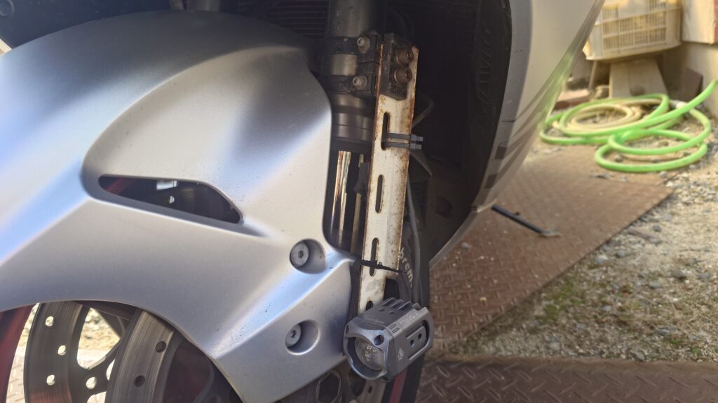 失敗店はステーが車体側でフォグ本体はステーにビスで取り付けているので、徐々にビスが緩んで照らす角度を度々調整しないといけなくなった点です。